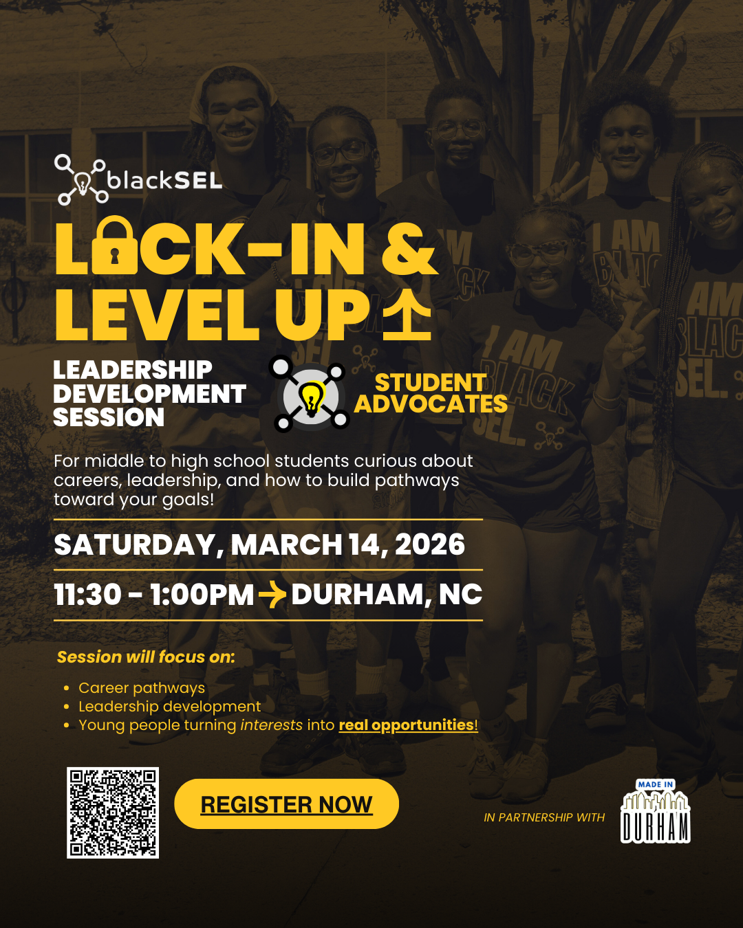 Black SEL is hosting a Leadership Development Session in Partnership with Made in Durham for middle and high school students interested in exploring careers, building leadership skills, and learning how to turn their interests into real opportunities.